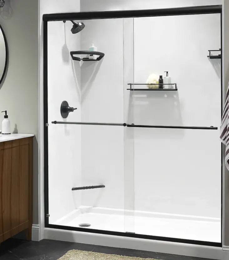 STANDARD FEATURES • Bypass Door Design with Euro Header • Two Ladder Towel Bars & Two T-Knobs • Two (2) Finger Pulls • 5/16” Thick Glass • 3” Bolt-thru Glass, Two-Wheeled, Hanging Brackets • Through-the-Glass Towel Bar and Knobs • Easy-Clean Glass Protection Included • Glass Overlap • Easy-Glide Wheels • Shower Dimensions: 48” W x 70” H 60” W x 70” H 60” W x 76” H • Tub Dimensions: 60” W x 62” H